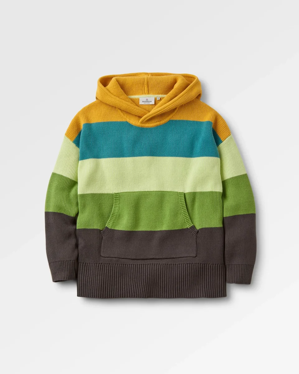 Hoodie en maille bio oversize Moments – Rayures multicolores jaune moutarde